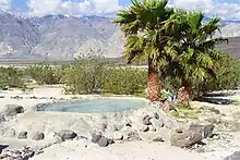 There are two primitive soaking pools fed by Palm Spring. The Wizard Pool is one of the hottest thermal springs in the Saline Valley with temperatures between 105 °F and 112 °F. The three and-a-half foot diameter hexagonal soaking pool was built in the 1980s from rock and concrete. Seating has been built surrounding the pool. The Volcano Pool has a cooler temperature than Wizard pool, and is also constructed from rock and concrete and is above ground, whereas Wizard is below ground. Volcano is 15 feet across, with temperatures ranging from 98 °F to 104 °F.[2]