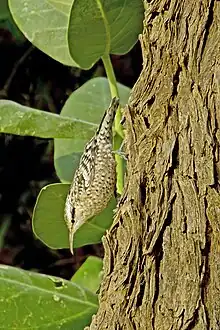 The African spotted creeper was formerly considered conspecific.[8] Together they were called spotted creeper. The Indian species is nowhere common but is found in locations scattered around parts of Rajasthan, Gujarat,[12] Haryana, Uttar Pradesh, central India (Bandhavgarh,[13] Jabalpur,[14] Bastar district[15][16]) Orissa,[17][18] northern Andhra Pradesh (Adilabad,[19] Kawal Wildlife Sanctuary[20]). In the past the slightly paler plumaged population in the arid zone of the Aravalli hills was separated as a subspecies rajputanae by Richard Meinertzhagen (and his wife)[21] but this is treated as part of a single population and combined into a single (nominate) subspecies.[4]