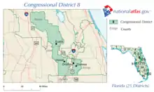 According to the state of Florida, 42% of the voters in this district are registered Republicans, and 36% are registered Democrats.[14] George W. Bush won this district with 52% of the vote in the 2000 presidential election, and with 54% of the vote in the 2004 presidential election.