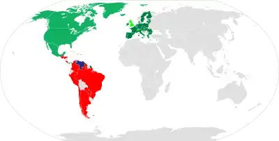 Through Petrocaribe, Caribbean countries including Haiti and Jamaica had been able to finance 40% of their Venezuelan crude oil purchases over 25 years at 1% interest; Cuba received free oil in exchange for medical services.[124] Reuters said, "The Caribbean region has long relied on oil and gas from Venezuela, which offered cheap financing through a program called Petrocaribe, though shipments have declined in recent years because of production problems at Venezuela's state-owned oil company PDVSA."[125] Research by the journalism group Connectas said that Venezuela had spent $28 billion worth of oil to buy support from 14 Caribbean countries; according to the Connectas study the social benefits that were intended for the countries of Petrocaribe were not realized, which they say was ignored by the Venezuelan government because Petrocaribe countries were intended to protect Venezuela's sovereignty in international organizations like the UN and OAS.[126][127]