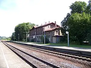 The station was opened on 15 October 1871 with the commissioning of the KönnernAschersleben section by the Magdeburg–Halberstadt Railway Company (Magdeburg-Halberstädter Eisenbahngesellschaft, MHE). With the construction of the Berlin-Blankenheim railway by the Prussian state railways, a second station was built west of the existing facilities. Since the MHE did not allow the state railway to use its entrance building, it opened its own entrance building on 15 May 1879; this was located to the east of the new line, thus between the two lines. After the nationalisation of the MHE in 1879, the building from 1871 was put to other uses.[4][5]