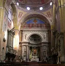 The main altar has a detached fresco depicting the Virgin and child by Stefano Dall'Arzere. In 1576, while the bubonic plague afflicted the town, this venerated image was carried in procession through the city from its original location near the Palazzo del Capitanio to this church. The ebbing of the plague was attributed to the miraculous icon. Every February 2, during the Festa dei Lumini recalls this event. An 18th-century bas-relief depicts the Last Supper while the organ on the left depicts Stories of the Image of the Madonna of the Carmine by Battista Bissoni. The apse was richly decorated by Antonio Noale. The walls have large 17th-century canvases, depicting Saints of the Carmelite order and Stories of the Old Testament.