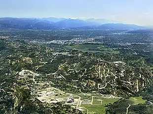 Aerial view of the Santa Susana Field Laboratory in the Simi Hills, with the San Fernando Valley and San Gabriel Mountains beyond to the east. The Energy Technology Engineering Center site is in the flat Area IV at the lower left, with the Rocket Test Field Laboratory sites in the hills at the center. (Spring 2005)