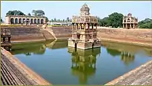 At the centre of the pond is Vasantha Mantapa, also known as karanji (fountain) mantapa, a symmetrical pillared tower which is built in Indo-Arabic style of architecture. It is built using granite, brick and mortar.[3] The design of this multi-levelled tower, which covers an area about 34 sq ft (3.2 m2), is in such a way that it appears to be floating in water when viewed from the banks of the pond. The arches, vaults and domes of the mantapa are built in the Arabic style of architecture while its columns, pyramidical towers and carvings are built in the Indian style. According to the local people, the water can cover the mantapa to a height of 10 feet (3.0 m) when the pond is full.