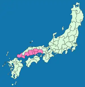 The region was established as one of the Gokishichidō (Five provinces and seven roads) during the Asuka period (538-710), and consisted of the following eight ancient provinces: Harima, Mimasaka, Bizen, Bitchū, Bingo, Aki, Suō and Nagato.[4] However, this system gradually disappeared by the Muromachi period (1333-1467).