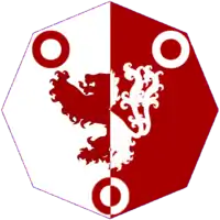 Per pale Argent and Gules a lion salient double queued between three annulets counterchanged.