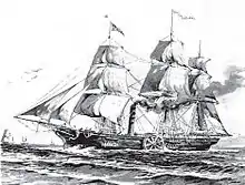 On June 2, Savannah, sailing at a speed of 9 or 10 knots, passed the sailing ship Pluto. After being informed by Captain Rogers that his novel vessel was functioning "remarkably well", the crew of Pluto gave Savannah three cheers, as "the happiest effort of mechanical genius that ever sailed the western sea." Savannah's next recorded encounter was not until June 19, off the coast of Ireland with the cutter HMS Kite, which made the same mistake as Contract three weeks earlier and chased the steamship for several hours believing it to be a sailing vessel on fire.[15] Unable to catch the ship, Kite eventually fired several warning shots, and Captain Rogers brought his vessel to a halt, whereupon Kite caught up and its commander asked permission to inspect the ship. Permission was granted, and the British sailors are said to have been "much gratified" by the satisfaction of their curiosity.[16]