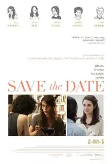 Save the Date is a 2012 American romantic comedy-drama film directed by Michael Mohan. It stars Lizzy Caplan and Alison Brie. It won the Achievement Award at the 2012 Newport Beach Film Festival and was nominated for the Grand Jury Prize at the 2012 Sundance Film Festival.