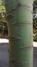 The mature tree typically has a straight trunk, up to 40 meters tall and 80 cm wide, that branches out only near the top. The bark is smooth and gray-green except by the scars left by fallen leaves. The leaves are bipinnate, a metre or more in length, with a green stem and 30–50 opposite pinnae, each with 40–60 leaflets 2–3 cm long; they are clustered near the end of the branches, and fall off completely in the dry season.[6] Young individuals, often unbranched and with leaves over 2 meters long, may be mistaken for ferns or palms.