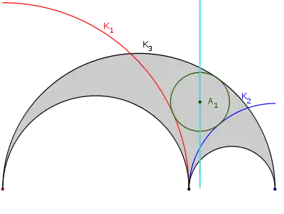 An arbelos is a shape bounded by three mutually-tangent semicircular arcs with collinear endpoints, with the two smaller arcs nested inside the larger one; let the endpoints of these three arcs be (in order along the line containing them) A, B, and C. Let K1 and K2 be two more arcs, centered at A and C, respectively, with radii AB and CB, so that these two arcs are tangent at B; let K3 be the largest of the three arcs of the arbelos. A circle, with the center A1, is then created tangent to the arcs K1, K2, and K3. This circle is congruent with Archimedes' twin circles, making it an Archimedean circle; it is one of the Schoch circles. The Schoch line is perpendicular to the line AC and passes through the point A1. It is also the location of the centers of infinitely many Archimedean circles, e.g. the Woo circles.[1]