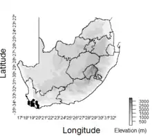 Schoenus exilis is found in the western region of the Western Cape Province of South Africa.[1] This species generally occurs on damp sites on sandstone-derived soils; however, it has also been collected from granite-derived soils.[1] The reported elevation range of S. exilis is between sea level and over 400 m.[1]