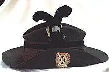 The regiment wore a slouch hat with kakhi and black silk in the pogri (only the Commanding Officer would wear the silk Murray of Atholl tartan in the pogri) bearing a cap badge with backing of yellow/red or blue (depending on if with soldier was in 1st 2nd or 3rd Regiment) and black cock feather. The cap badge cross of St Andrew with a sprig of laurel on one side and a branch of juniper leaves on the other.[22]