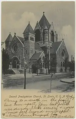 The congregation was founded in 1838 by the Old School Presbytery of St. Louis.[2] It has had three buildings. Its first building, designed in the Greek Revival architectural style and completed in 1840, was located at Fifth (Broadway) and Walnut Streets.[3] Thirty years later, in 1870, a second church building was erected on Lucas Place at Seventeenth Street.[3]
