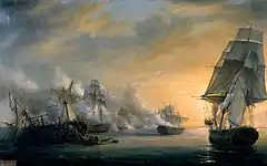 With Real Carlos disabled, Keats pushed on into combat with Saint Antoine, the combined French and Spanish crew engaging the British vessel as it approached.[21] At 23:50, Keats laid his ship close alongside the new French ship, beginning a close and heated action as the ships of the line exchanged broadsides with one another in pitch darkness and with an increasing wind.[16] For 30 minutes the battle continued until, with the ships off Cape Spartel in North Africa, a wounded Le Ray decided that his ship was no longer able to contest the action and hailed Superb to announce that he had surrendered. The halyards that held up his pennant had however become tangled in the rigging, giving the appearance that the ship was still in French hands: this later led it to be attacked repeatedly by other British ships as they came up during the night.[22] Formidable was also to the rear of the combined squadron, escaping attack by feigning British signal lights until it had safely passed the battle between Superb and Saint Antoine.[23] Keats remained with his prize, awaiting the arrival of the rest of the squadron: Caesar, Venerable, Spencer and Thames arrived after midnight, all firing on Saint Antoine as they passed before continuing westwards in search of the remainder of Moreno's squadron. Superb was later joined by Carlotta and the small ships HMS Calpe and Louisa, which remained on hand during the night.[24]