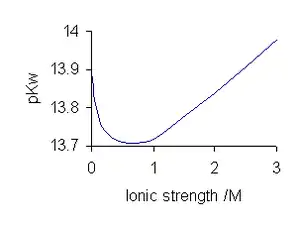 With electrolyte solutions, the value of pKw is dependent on ionic strength of the electrolyte. Values for sodium chloride are typical for a 1:1 electrolyte. With 1:2 electrolytes, MX2, pKw decreases with increasing ionic strength.[8]