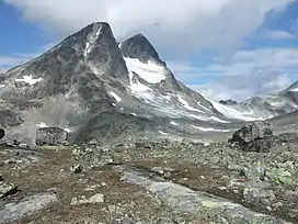 Semeltinden is a mountain in Lom Municipality in Innlandet county, Norway. The 2,237-metre (7,339 ft) tall mountain is located in the Jotunheimen mountains within Jotunheimen National Park. The mountain sits about 37 kilometres (23 mi) southeast of the village of Fossbergom and about 38 kilometres (24 mi) northeast of the village of Øvre Årdal. The mountain is surrounded by several other notable mountains including Hinnotefjellet and Reinstinden to the east; Storådalshøi and Høgtunga to the southeast; Skarddalseggi and Store Rauddalseggi to the southwest; Høgvagltindene to the west; Visbretinden, Semelholstinden, Langvasshøi, and Urdadalstindene to the northwest; and Søre Hellstugutinden, Nestsøre Hellstugutinden, and Store Hellstugutinden to the northeast.[1]