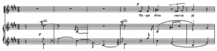 A characteristic modulation, quoted in Delage's In morte di un samouraï of 1950,[29] caught Flothuis's attention. At the beginning of "L'été ..." the first two chords have a double false relation (of C♭ to B♭, and G♭ to G♮) followed by an insistent fourth in the bass, which Flothuis interprets as "a double pedal point (B♭ + E♭)".[lower-alpha 14][28] This evokes the distant beating of the temple bell and is heard twelve times in just nine measures, always off-beat of the melody:
