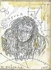 Sergey Ivanovich Kalmykov (Russian: Серге́й Иванович Калмыков; 6 October 1891 – 27 April 1967) was a Soviet painter, draughtsman, and writer. Barely known during his art career and abandoned at the end of his life, he is currently regarded as one of the most important figures of the Russian avant-garde art, an author of over fifteen hundred of paintings, drawings, illustrations, theater decorations, and numerous writings. During his life Kalmykov has developed an original style of painting and draftsmanship that can be described as 'magical impressionism'.