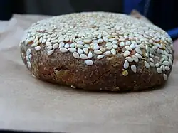 Sesame seed cake (Chinese: 芝麻醬燒餅) is a cake made of sesame seeds, often combined with honey as a sweetener. The cake is round and is brown in color with sesame seeds sprinkled evenly on the surface of the cake. Although there are several variations, it is quite similar to the Huangqiao sesame cake (simplified Chinese: 黄桥烧饼).