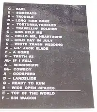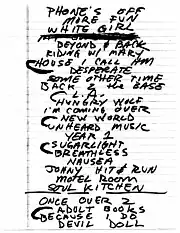 A set list, or setlist, is typically a handwritten or printed document created as an ordered list of songs, jokes,[1] stories and other elements an artist intends to present during a specific performance.