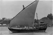 The expedition left Al Wajh on 24 January and proceeded via dhow to Al Qunfudhah, arriving on 7 February.[7] Here many of the expedition disguised themselves in Arab robes and posed as smugglers of animal hides; the Palestinian Arabs in the party were disguised as gardeners.[7][8][12] Türstig masqueraded as an official of the Red Cross and his eighty packs of photographic equipment were disguised as hospital supplies.[7] On 13 February the expedition boarded a sambuk to make the crossing of the Red Sea to Africa.[7]