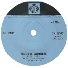 "She's Got Everything" is a song written by Ray Davies and released by English rock band the Kinks. It first appeared as the B-side of the Kinks' 1968 single, "Days".
