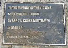 Most of the murders along the edge of the River Danube took place around December 1944 and January 1945, when the members of the Hungarian Arrow Cross Party police ("Nyilas") took as many as 20,000 Jews from the newly established Budapest ghetto and executed them along the river bank.[4] Tommy Dick describes one surviving person's story from these operations in his book Getting Out Alive[5] and testimony.[6] In February 1945, the Soviet forces liberated Budapest.