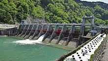 The Shogawa Goguchi Dam is a gravity dam on the Shō River in Shogawa, Toyama Prefecture, Japan. It was constructed between 1934 and 1939. The dam has an associated 23.4 MW hydroelectric power station which was commissioned in two stages, December 1939 and March 1967. Of the nine dams on the Shō River it is the furthest downstream.[3]