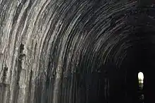 There are actually two tunnels: at the northern portal, the towpath splits off and rises on a ramp and then enters a tunnel of its own, until it reaches the road which crosses the tunnel; having crossed this the path then descends on another ramp to reach the southern portal. The interior of the tunnel is unusually wet and this has led to the creation of flowstone formations.
