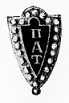 The membership badge was a black enamel shield surrounded by jewels. The Greek letters, in gold, were inscribed vertically on the shield. A jewel was between the enamel and the surrounding jewel photo.[8]