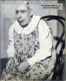 Schlitzie (alternatively spelled Schlitze or Shlitze; September 10, 1901 – September 24, 1971), possibly born Simon Metz[1] and legally Schlitze Surtees, was an American sideshow performer. He also appeared in a few films, and is best known for his role in the 1932 movie Freaks. His lifelong career on the outdoor entertainment circuit as a major sideshow attraction with Barnum & Bailey, among others, made him a popular cultural icon.