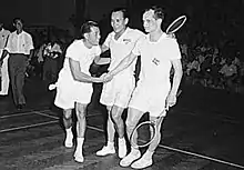 Wong Peng Soon (left), captain of the Malaya Thomas Cup team, being congratulated by Ole Jensen from Denmark (right) at the 1955 Thomas Cup.