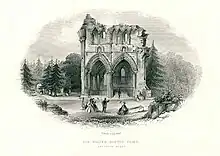 Scott was buried in Dryburgh Abbey, where his wife had earlier been interred. Lady Scott had been buried as an Episcopalian; at Scott's own funeral, three ministers of the Church of Scotland officiated at Abbotsford and the service at Dryburgh was conducted by an Episcopal clergyman.[65]