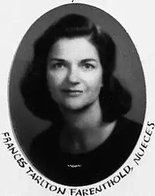 Mary Frances Tarlton was born in Corpus Christi, Texas, on October 2, 1926, the daughter of Catherine (Bluntzer) and Benjamin Dudley Tarlton, Jr., a district attorney.[2] She was nicknamed "Sissy" as her slightly older brother could not yet pronounce the word sister.[2] After attending the Hockaday School,[3] Farenthold graduated from Vassar College in 1946. In 1949, she graduated from the University of Texas School of Law. She was one of only three women in a class of 800. Farenthold came from a line of lawyers and judges. Her grandfather, Judge Benjamin D. Tarlton Sr., served as chief justice of the Texas Court of Civil Appeals, a state legislator, professor at the University of Texas School of Law and as the namesake of the University of Texas School of Law Tarlton Law Library.[4][5]