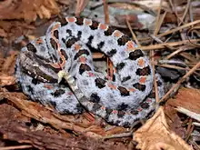 Common names for S. miliarius include pygmy rattlesnake, ground rattlesnake, hog-nosed rattlesnake, little rattlesnake, miliar(y) rattlesnake, North American smaller rattlesnake, oak-leaf rattler, pygmy ground rattlesnake, small rattlesnake, southeastern ground rattlesnake, southern ground rattlesnake, southern pygmy rattlesnake, spotted rattler, spotted rattlesnake,[2] southern rattlesnake.[5] Older common names might include bastard rattlesnake, nipple snake, Carolina ground rattlesnake, brick red rattlesnake, Carolina pygmy rattlesnake, Catesby's small snake, dwarf rattlesnake, eastern pygmy rattlesnake, grey rattlesnake, and ground rattler (Garman, 1887).