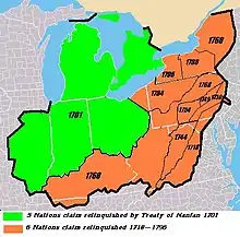 The Six Nations land cessions were a series of land cessions by the Haudenosaunee and Lenape which ceded large amounts of land, including both recently conquered territories acquired from other indigenous peoples in the Beaver Wars, and ancestral lands to the Thirteen Colonies and the United States. The land ceded covered, partially or in the entire, the U.S. states of New York, Pennsylvania, Maryland, Virginia, West Virginia, Kentucky, Ohio, Tennessee and North Carolina. They were bordered to the west by the Algonquian lands in the Ohio Country, Cherokee lands to the south, and Muscogee and Choctaw lands to the southeast.