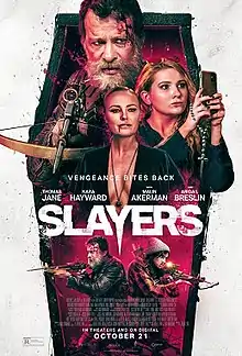 Slayers is a 2022 American comedy horror film, written, produced and directed by K. Asher Levin. It stars Thomas Jane, Kara Hayward, Jack Donnelly, Lydia Hearst, Malin Akerman, and Abigail Breslin. The film was released in theaters and digitally on October 21, 2022, by The Avenue Entertainment.[1]