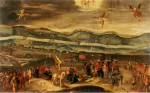 Both sides introduced new tactics, units and equipment based on Western models, but the Polish–Lithuanian forces proved more adept with these innovations than the Russians.[10] However, the main factors that kept the Russians from winning were the delay in moving siege artillery to Smolensk and the severe disruption of Russian supply lines by Polish cavalry.[10] A scapegoat was nevertheless needed: Mikhail Shein was accused of treason and, together with his second-in-command Artemy Izmaylov and the latter's son Vasily, executed in Moscow on April 28, 1634.[5][6][7] Learning from this defeat, the Russians would adopt new and more successful tactics in the Polish–Russian War (1654–1656).[36]