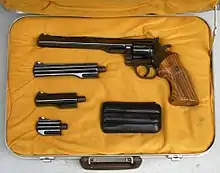 Introduced in the early 1970s, the Model 15-2 became the best-known and the best-selling Dan Wesson Firearms revolver model to go into production. This 6-shot, .357 Magnum revolver uses a unique interchangeable barrel system, including a 2.5 in (64 mm) snub nose barrel along with 4 in (100 mm), 6 in (150 mm), 8 in (200 mm), 10 in (250 mm), 12 in (300 mm), and 15 in (380 mm), partial or fully-lugged shrouds with choices of solid or ventilated ribs, plus removable and interchangeable front sights. The Model 15-2 could be ordered as "Pistol Pacs" with 4 (or more) barrel/shroud sets shipped inside a fiberglass briefcase with barrel changing tool and clearance gauges; however, most pistols were sold with only one barrel, with the buyers able to purchase other barrels later. All barrels and shrouds within a model series are compatible, thus a Model 15-2 frame from the 1970s may be equipped with a barrel from the 1990s and a shroud made in 2016. The 15-2 increased sales markedly over the earlier models and were often seen in use with both target shooters and hunters. Model 44s are large-frame models in .44 Magnum with interchangeable barrels, including a 2.5 in (64 mm) snubnose barrel.