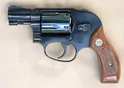 A snubnosed revolver (colloquially known as a snubbie, belly gun, or bulldog revolver) is a small, medium, or large frame revolver with a short barrel, generally less than 4 inches in length. Smaller such revolvers are often made with "bobbed" or "shrouded" hammers and there are also "hammerless" models (where the hammer is entirely internal); the point is to allow the gun to be drawn with little risk of it snagging on clothing. Since the external movement of the mechanism is minimal or nil, shrouded and hammerless models may be fired from within clothing.[1] The design of these revolvers compromises range and accuracy at a distance in favor of maneuverability and ease of carry and concealment.