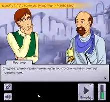 Claims by opponents are drawn from the "common ground" of what both the player-character Socrates and the opponent agree to be true. The opponent then builds on his claims in order to draw a conclusion. If a claim is vague, irrelevant or does not build up from the common ground, the player can question it. The players win a round when they challenge a statement made by their opponents with a counter-argument.[23][25] The game has a "chronological difficulty curve", which increases the challenge as players meet characters who lived more recently.[26]