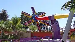 Sol Spin is a swinging Top Scan ride at Knott's Berry Farm built by Mondial Rides. Riders spins in a circular rotation while swinging in an angle. The ride opened to the general public on April 21, 2017 in the Fiesta Village section of the park.[1] Designed by Mondial, Sol Spin is a tipsy top turvy adventure taking places 6 stories high over Fiesta Village. As the ride lifts off the ground, riders begin spinning in a circular motion while guests are spun around. At its peak, Sol Spin rotates guests in circular motion at 60 feet in the air. Riders can experience up to 4gs at the peak of the ride. In addition, the ride is located on the former spot of Windseeker which was also built by Mondial. Sol Spin is unique as it is the largest Mondial Top Scan to this day. Knott's Sol Spin was customized to fit in the former location of Windseeker.[2]