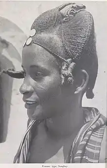 The different strata of the Songhai have included the kings and warriors, the scribes, the artisans, the weavers, the hunters, the fishermen, the leather workers and hairdressers (Wanzam), and the domestic slaves (Horso, Bannye). Each caste reveres its own guardian spirit.[18][21] Some scholars such as John Shoup list these strata in three categories: free (chiefs, farmers and herders), servile (artists, musicians and griots), and the slave class.[24] The servile group were socially required to be endogamous, while the slaves could be emancipated over four generations. The highest social level, states Shoup, claim to have descended from King Sonni 'Ali Ber and their modern era hereditary occupation has been Sohance (sorcery). The traditionally free strata of the Songhai proper and Zarma have owned property and herds, and these have dominated the political system and governments during and after the French colonial rule.[24] Within the stratified social system, the Islamic system of polygynous marriages is a norm, with preferred partners being cross cousins.[25][26] This endogamy within Songhai-Zarma people is similar to other ethnic groups in West Africa.[27]