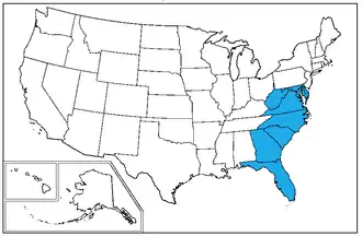 This division includes eight states and one district; Delaware, Florida, Georgia, Maryland, North Carolina, South Carolina, Virginia, West Virginia and the District of Columbia.[1] This division is also a recognized geographical division used by the United States Geological Survey.[2]: 2 All entities within the region apart from the District of Columbia and West Virginia border the North Atlantic Ocean.