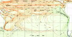 The Southern Pacific Gyre is part of the Earth's system of rotating ocean currents, bounded by the Equator to the north, Australia to the west, the Antarctic Circumpolar Current to the south, and South America to the east.[1] The center of the South Pacific Gyre is the oceanic pole of inaccessibility, the site on Earth farthest from any continents and productive ocean regions and is regarded as Earth's largest oceanic desert.[2] With an area of 37 million square kilometres it makes up ~10 % of the Earth's ocean surface.[3] The gyre, as with Earth's other four gyres, contains an area with elevated concentrations of pelagic plastics, chemical sludge, and other debris known as the South Pacific garbage patch.[4]