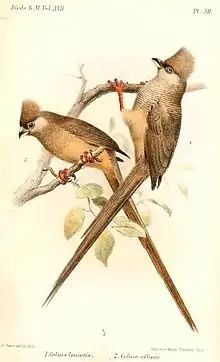 - ↑ de Juana, E. (2001). "Speckled mousebird". In del Hoyo, J.; Elliott, A.; Sargatal, J. (eds.). Handbook of the Birds of the World. Vol. 6: Mousebirds to Hornbills. Barcelona, Spain: Lynx Edicions. p. 75. ISBN 978-84-87334-30-6.