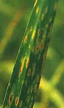 Early lesions are characterized by small, dark brown lesions 1 to 2 mm long without chlorotic margin. In susceptible genotypes, these lesions extend very quickly in oval to elongated blotches, light brown to dark brown in colour. They may reach several centimetres before coalescing and inducing the death of the leaf. Fruiting structures develop readily under humid conditions and are generally easily observed on old lesions. If spikelets are affected, it can result in shrivelled grain and black point, a dark staining of the embryo end of the seed.[6] The small dark brown spots on the leaves contrast with the larger, light brown spots or blotches produced by tan spot and septoria avenae blotch.[2]