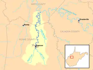 Spring Creek is formed just south of the city of Spencer in northern Roane County by the confluence of the Left Fork Spring Creek,[1] 8 miles (13 km) long,[6] which rises near the community of Clover and flows northwestward, paralleled for most of its course by West Virginia Route 36; and the Right Fork Spring Creek,[3] 7.8 miles (12.6 km) long,[6] which rises near the community of Speed and flows northward, paralleled for most of its course by U.S. Route 119. From the confluence of its forks, Spring Creek flows northward through Spencer and northern Roane County into southeastern Wirt County, where it flows into the Little Kanawha River from the south at the community of Sanoma, approximately 8 miles (13 km) southeast of Elizabeth.[7]