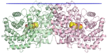 ![]() The crystallographic structure of the squalene-hopene cyclase dimer, with the membrane position indicated in blue, the two monomers in green and pink, and a substrate mimetic in the central cavity in yellow.[1] | |||||||||