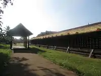 Built in the silent and picturesque land on the banks of Manimala river, this icon of Kerala temple architecture, covers an area of 8.5 acres and ranks first among the temples of old Travancore state in terms of area inside the compound wall.[3] The temple is surrounded on all sides by 12 feet, tall 566 feet long, 4.5 feet thick red granite compound walls with a two-storied gopuram (gate tower) on each side.[2] This huge wall was built in 57 BC and is believed that it was completed in a single night by bhoothagana (servants) of The Lord. Outside eastern wall a big pond covering 1.5 acres is seen in north-eastern direction with a copper flagstaff on its southern bank. A platform for performing kathakali is seen just in front of the eastern entrance. Inside the wall pradakshina veethi or outer circumambulation path is seen with four small aankottils (places where the deity is taken out and kept for worship inside temple wall) and a big one on south-eastern corner. South-east to this an oottupura or dining hall is seen which is built in all other temples only on northern side and this is unique to Sreevallabha temple only.[11] Temple auditorium and administrative offices can be seen next to this. Smaller shrines for lord Ganapathy and Ayyappan and another auditorium are seen in south-western side. The position of kshethra palan or temple guard which is strictly built in all temples on northern side is found here just in front of Ganapathy's shrine i.e. on southern side which also is another peculiarity found nowhere else.[4] The sacred fig and mango trees beneath which sage Durvasa meditated is found near Ayyappan shrine. Just outside the western gopuram, Sankaramangalth Illam where Sreedevi Antharjanam lived is seen well preserved for the initiation of any pooja in the temple. Northern gopuram is always closed and is opened only for Uthra Sreebali festival. North east to pradakshina veethi, a self originated pond called Jalavanthi or Khandakarna theerthem which is believed to contain 64 hidden idols of the deity is seen. It is for only the use of priests. Spot where sage Vedavyasa and sage Durvasa disappeared is found on its eastern bank and resting building for the priests on southern side. North to the temple a roofless shrine dedicated to kurayappa swamy is seen. There is no pooja here, but only banana as naivedyam. The bahir bali vrutham or outer circle of sacrificial stones is built inner to bahir pradakshina veethi. The temple koothambalam (stage) was destroyed by fire in 1915.[8] The most highlighted construction of the temple is the Garuda dhvaja sthambam or flagstaff of Garuda,[4][11][12] the majestic eagle mount of lord Vishnu. This monolithic structure is completely built from black granite and elevated 53.5 feet above the ground with its lower end touching water table.[13] Constructed in 57 BC, this structure was also built in a single night along with the outer wall. And an amazing fact is that no black granites can be found in an area ten miles around the temple. A 3 feet massive idol of Garuda is placed on top of it, facing the main sanctum. Since this flagstaff started slanting and reached its current position, a three tiered copper roofed construction has been made all around it to prevent further slanting. West to this, currently used golden flagstaff can be seen.[14]
